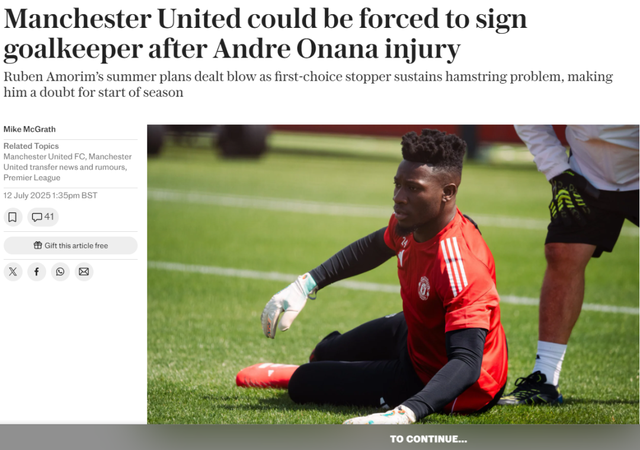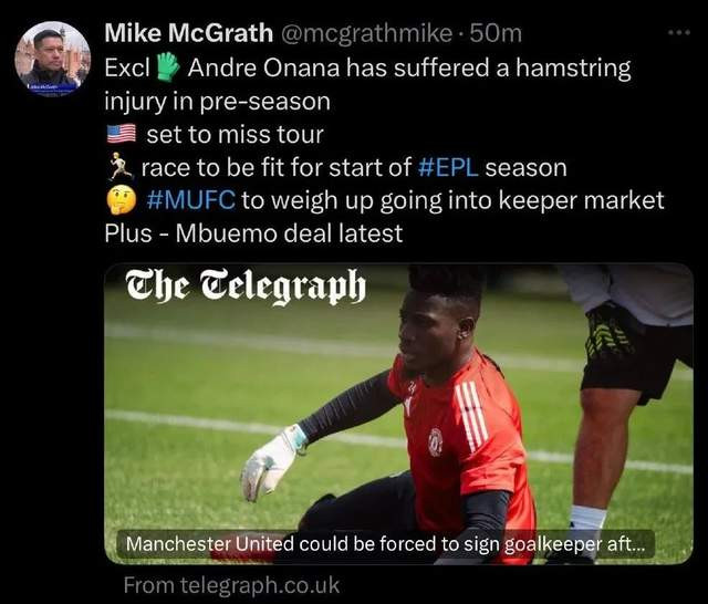 据《每日电讯报》、BBC、天空体育、《曼彻斯特晚报》、《每日邮报》、罗马诺等消息源确认,曼联主力门将安德烈-奥纳纳在季前首训腿筋受伤,可能无缘新赛季开局的比赛。
